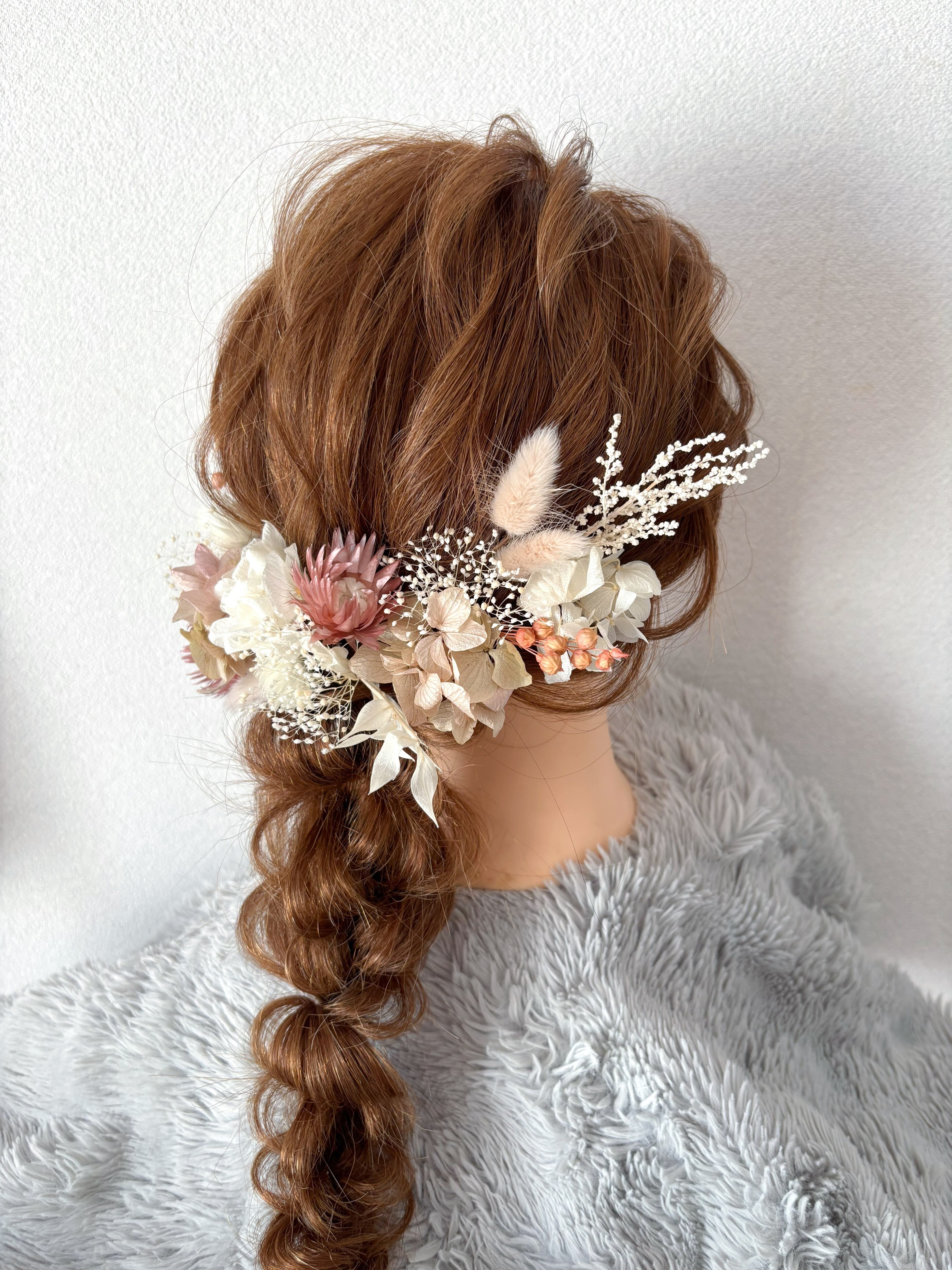 髪飾りにボリュームを持たせたい場合は花材の追加をお勧めいたします。ご相談くださいませ。
