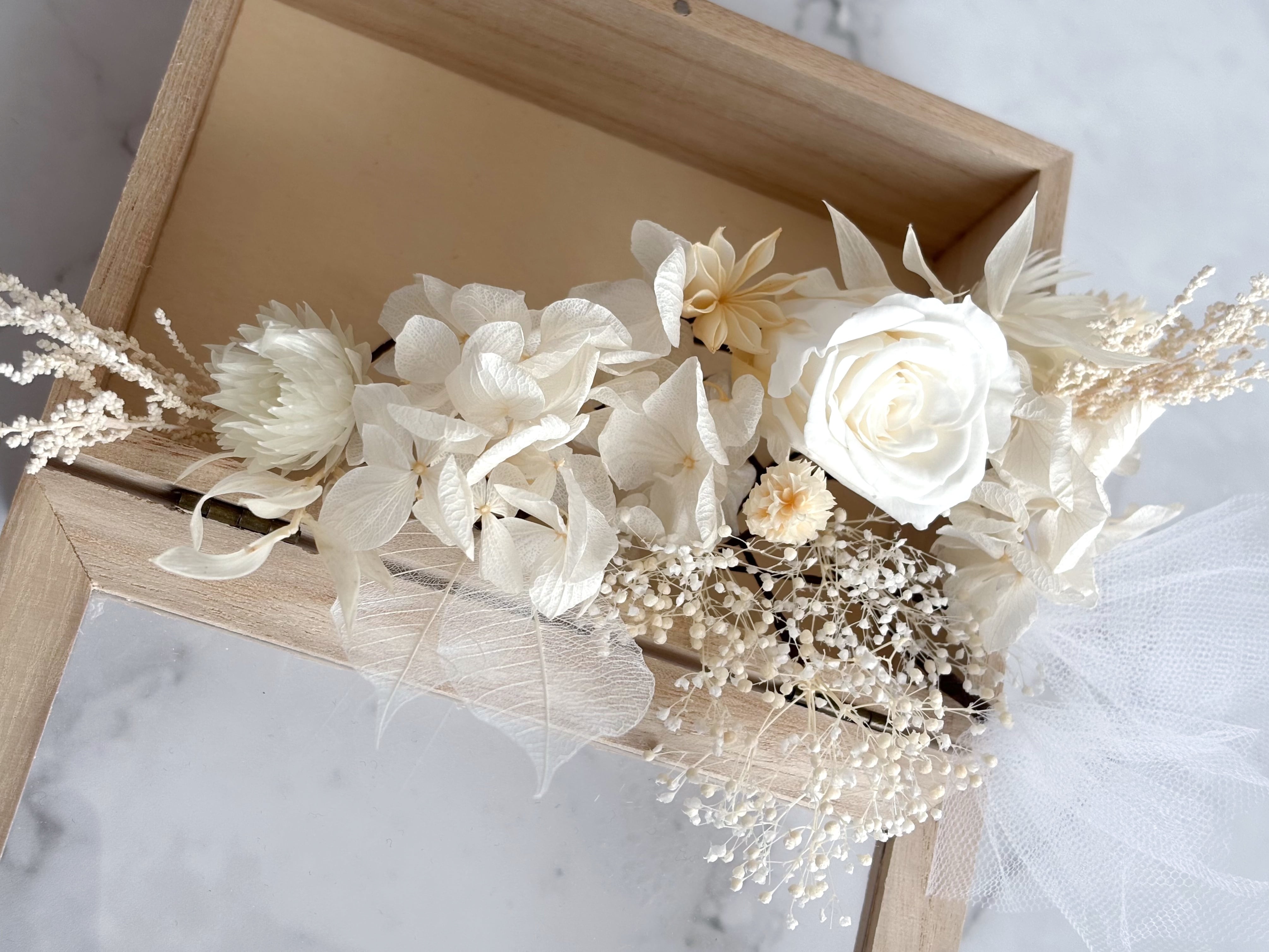 髪飾りにボリュームを持たせたい場合は花材の追加をお勧めいたします。ご相談くださいませ。